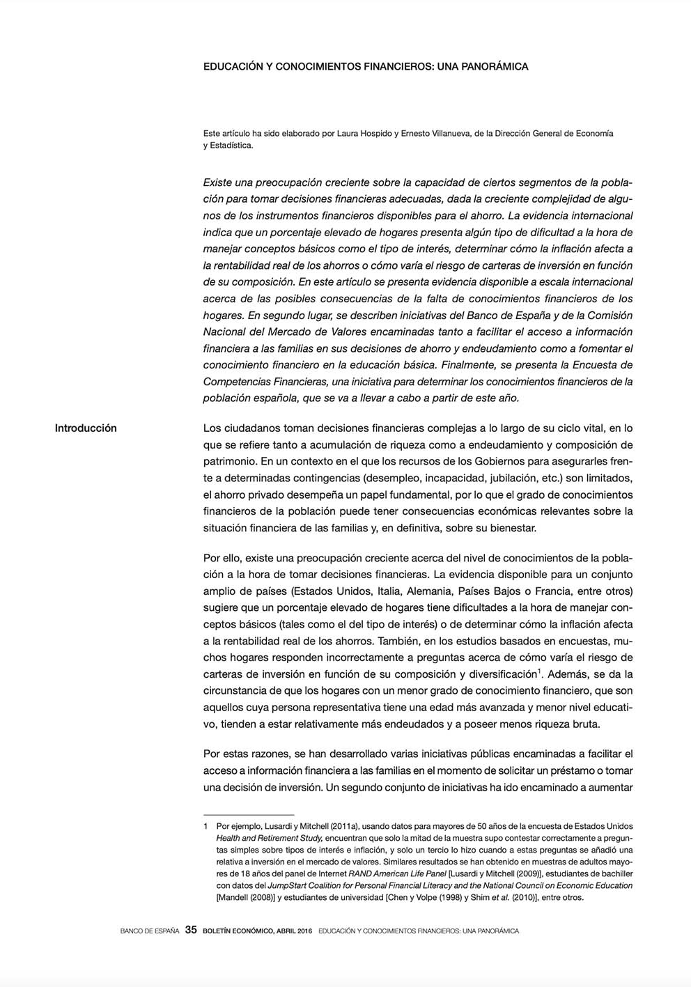 El artículo contiene evidencias de la falta de comprensión tanto de los conceptos financieros básicos, así como de los productos de ahorro e inversión, esto no ocurre solo en territorio español, también en países vecinos. Con toda la información que alberga, se llega a la conclusión que en los hogares donde se tiene un menor conocimiento financiero se observa una tendencia a tener menos acciones cotizadas, además de pagar mayores tasas por sus préstamos, lo que termina derivando en un mayor nivel de endeudamiento y por ende menor riqueza neta.