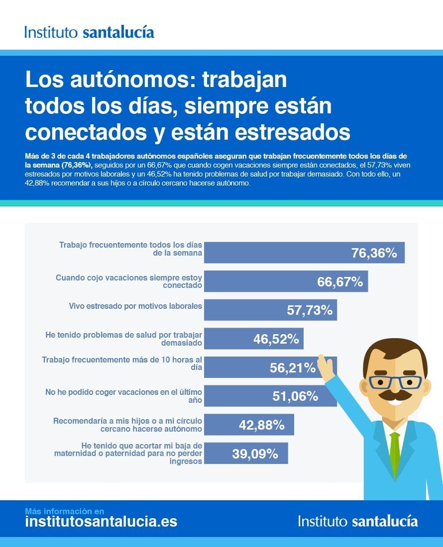 - El estrés es más común entre los autónomos que entre los trabajadores por cuenta ajena. El 46% asegura que ha tenido problemas de salud por trabajar demasiado.